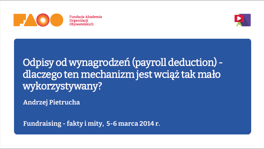 Film edukacyjny Film, w którym występuje Andrzej Pietrucha z Fundacji BOŚ, przedstawia założenia i zasady działania programu odpisów od pensji jako narzędzia fundraisingowego.